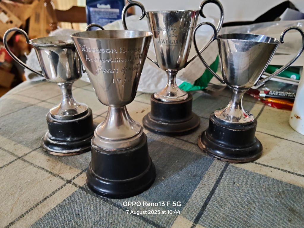 Jean was pleasantly surprised as she cleared out and sorted the boxes from her previous home. Among the items, she discovered a bundle of parcels wrapped in bubble wrap and a large plastic bag. To her delight, these were small award cups, a testament to her achievements in school and sports.